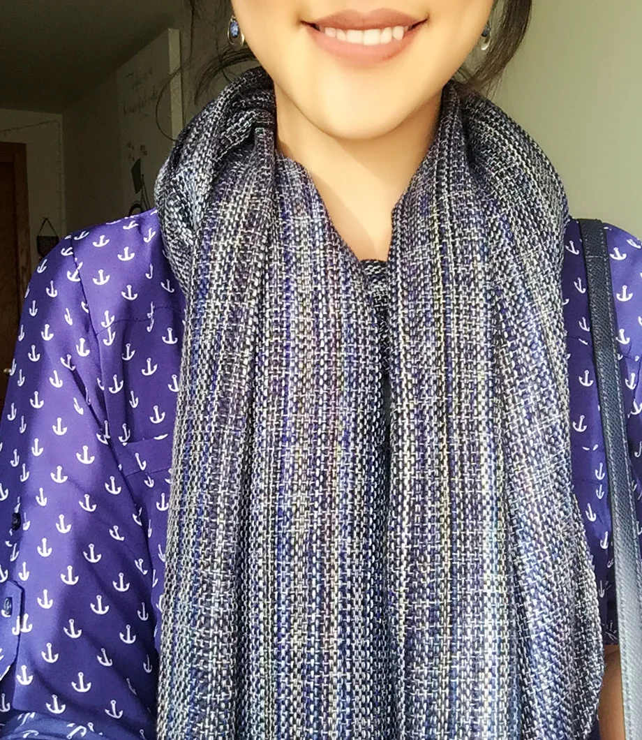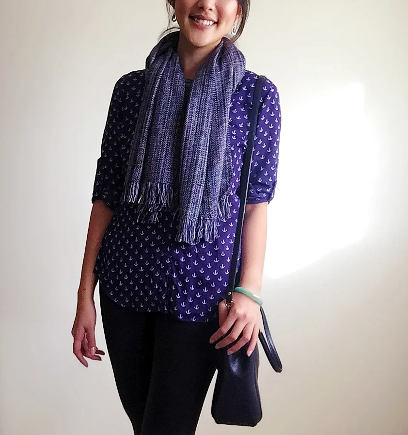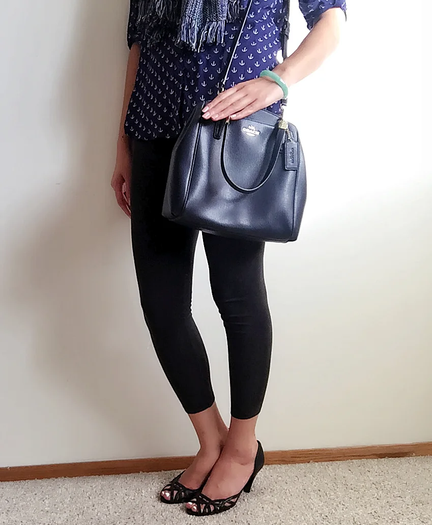 Top: Express / Scarf: Gift / Bag: Coach / Earrings: Kohl's / Shoes: Goodwill Find!
